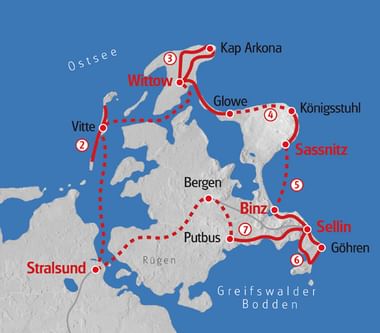 U wandelt afwisselend over kleine zijweggetjes, geasfalteerde wegen of zanderige bos- en veldpaden. Het landschap van het eiland Rügen is overwegend vlak tot licht heuvelachtig. U moet een goede basisconditie hebben.